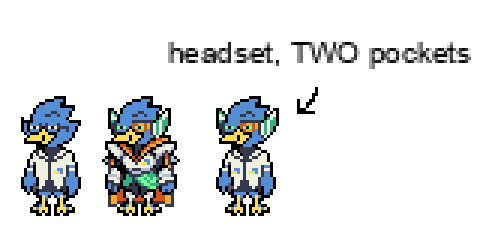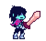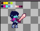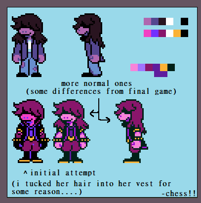最初に作ったのは~…たしか、Chapter 1の「闇の世界」用の、クリスとスージィの仮スプライトだったと思います。キャラクターデザインはGigi※が作ってくれたのがあったけど、スプライトはまだ「光の世界」用しかなくて、トビーに作るよう頼まれたんです。その仮スプライトをベースに、テミーが最終版を仕上げてくれました。