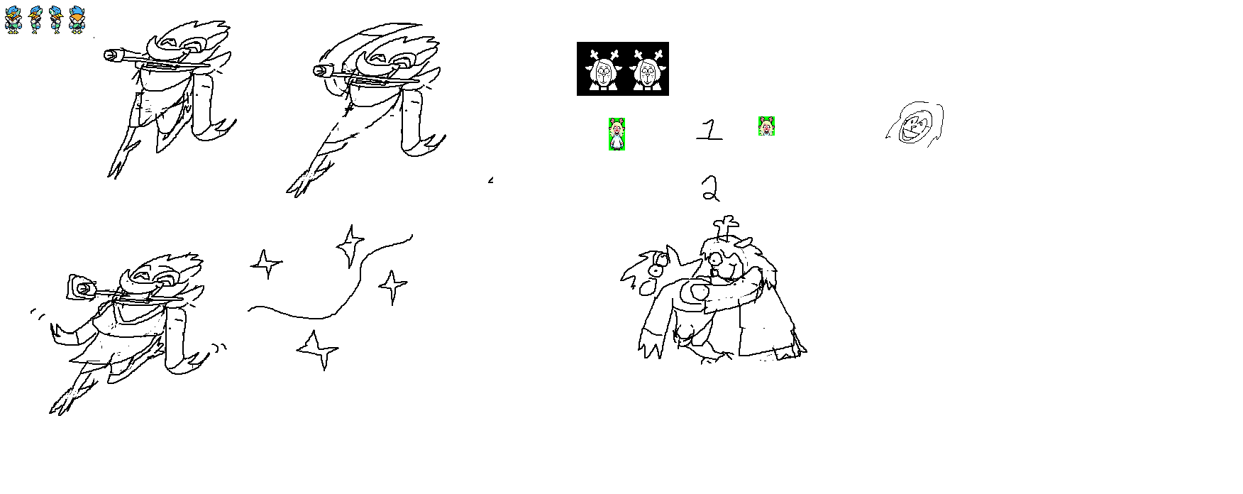パレッタの初期アート…これは、なんなんでしょう?ちなみに、フィールド上のスプライトはGigiが描き直してくれたバージョンじゃなくて、僕が描いたこのコンセプトアートのほうに寄せられてると思います。キャッスルタウンのカフェにいるやつがちょっと違うのは、そのせいです。