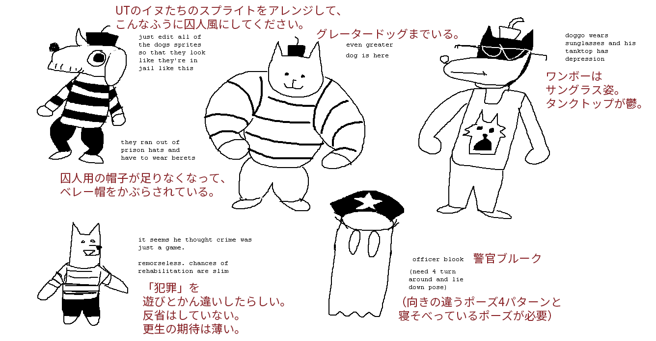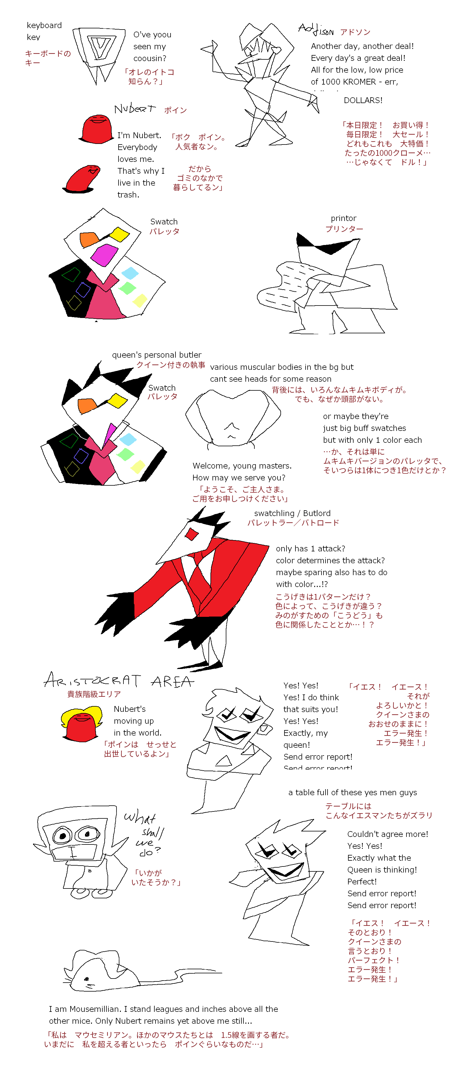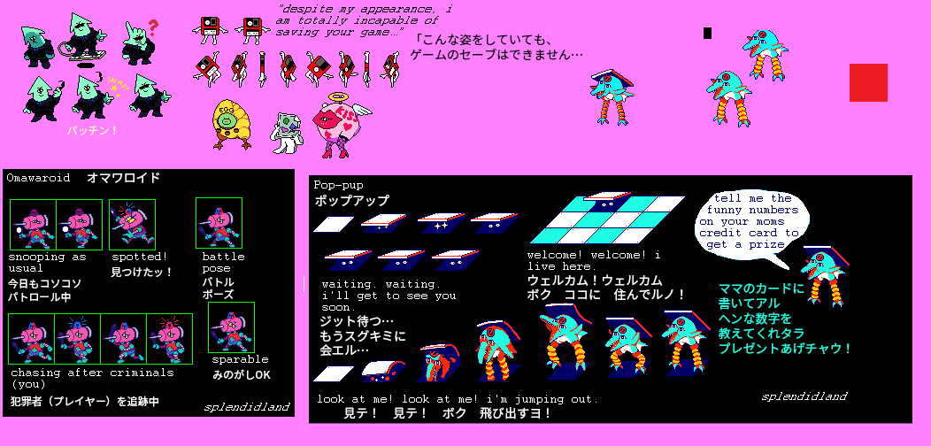 「プリンター」はボツになりましたが、スプライトとダイアログはできていて、このキャラが演奏するプリンターをテーマにした曲もあったんですが…NPCが多すぎるなと思ってカットしました。