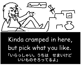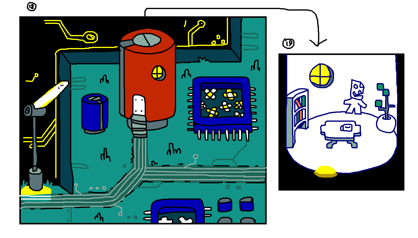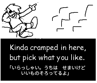 Chapter 1を作る前に描いたもの。キャラクターは仮コンセプトで、実際に使うキャラとして描いたものではありません。単に、 「こんなふうにショップのビジュアルにイカしたキャラを配置できるね」という例を描いてみただけ。