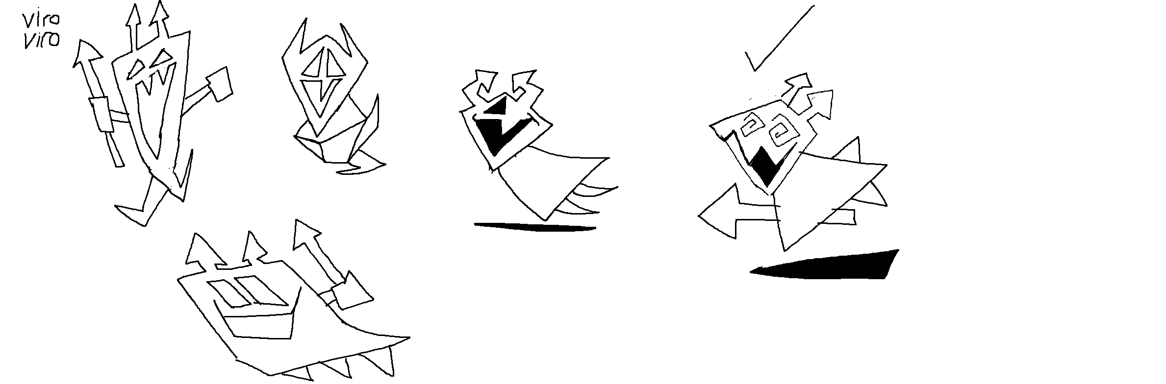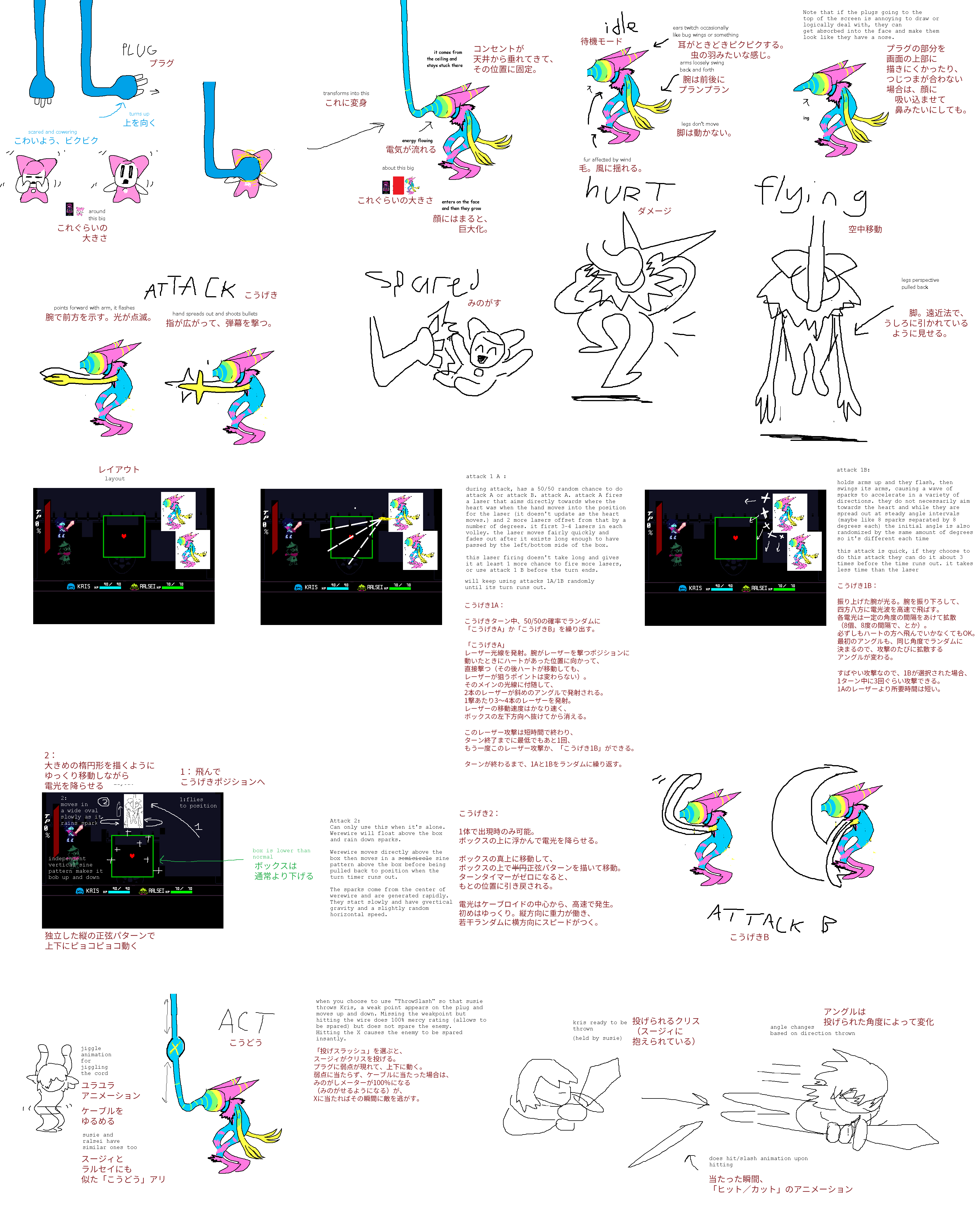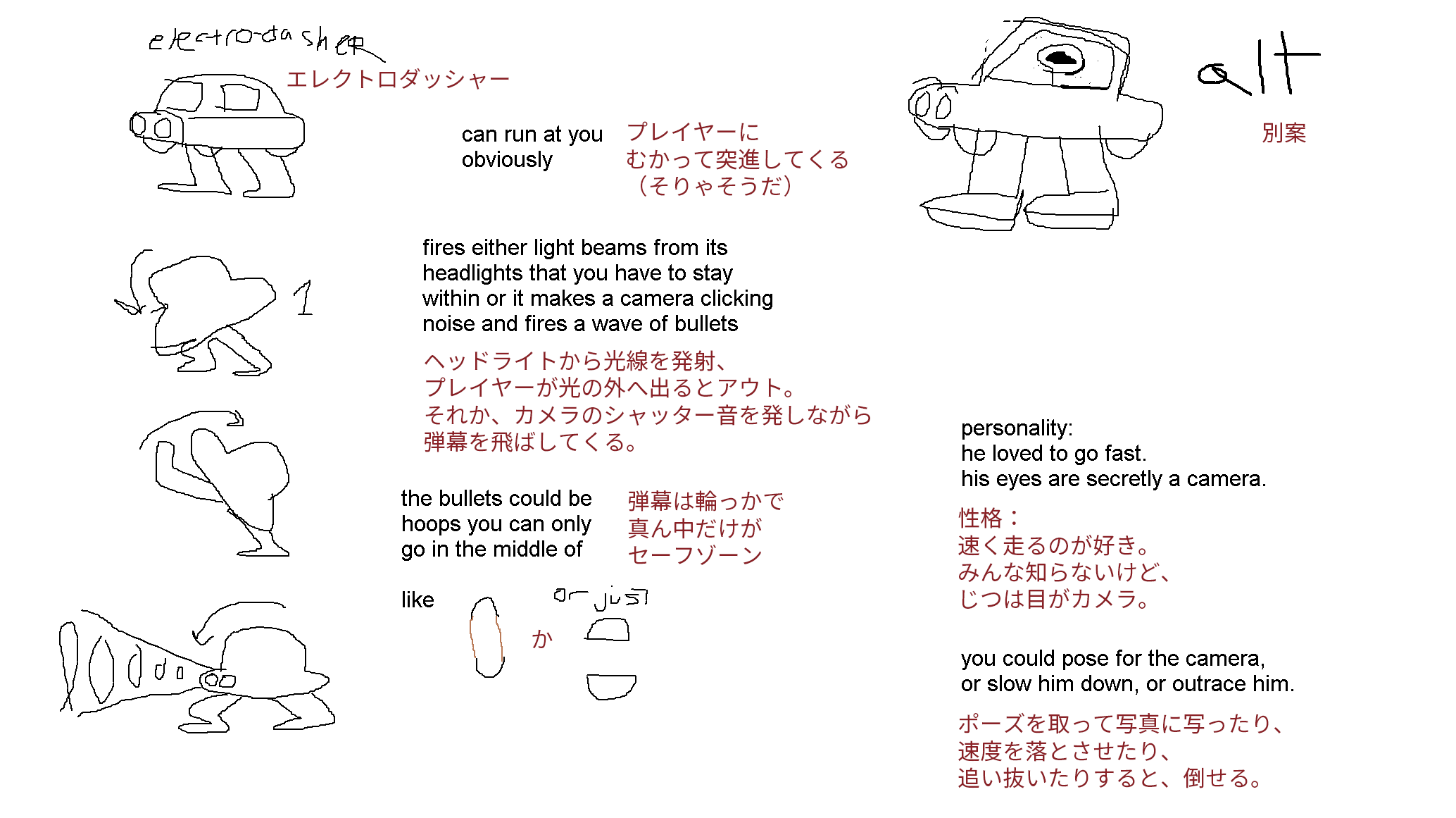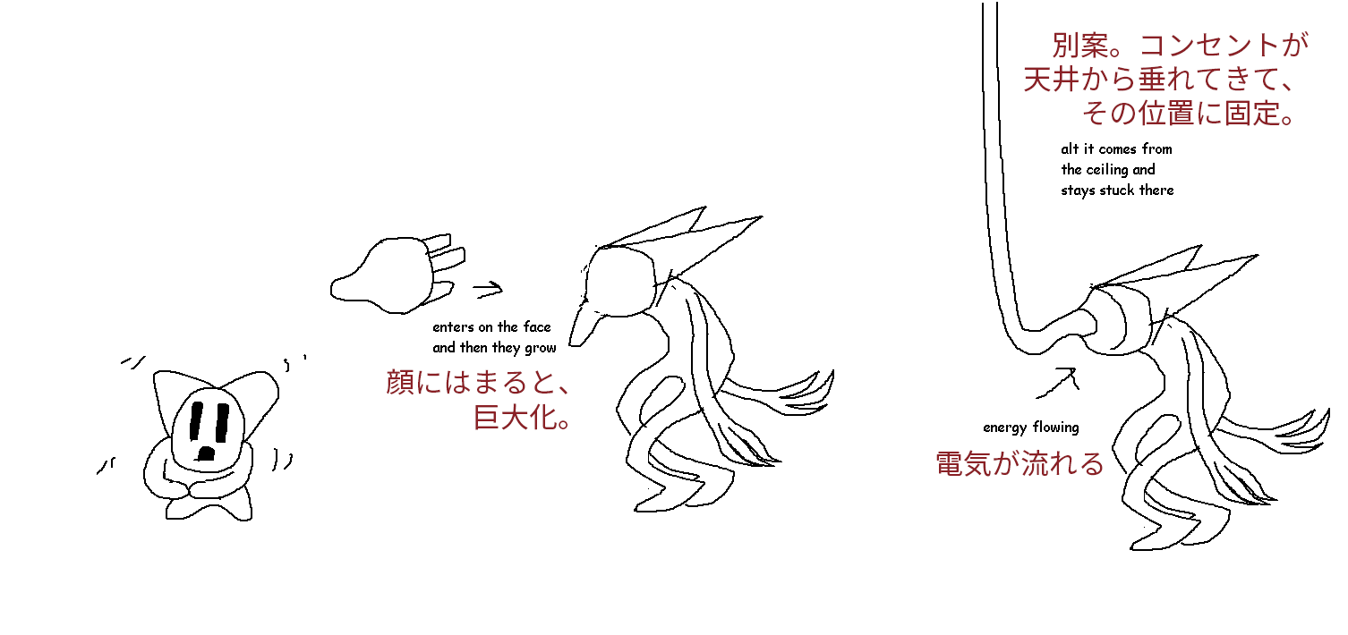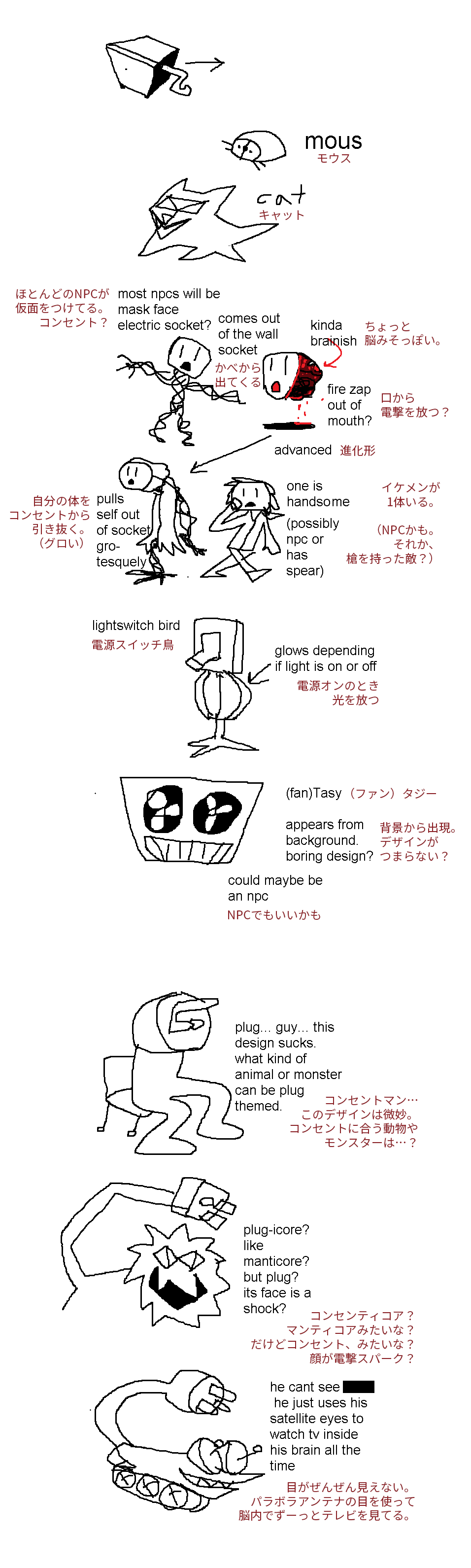 Chapter 2のアイデアをあれこれ出しながら、かなり初期のころに描いたものの1つ。当初から、顔がコンセントになっている敵を入れたいと思っていました。