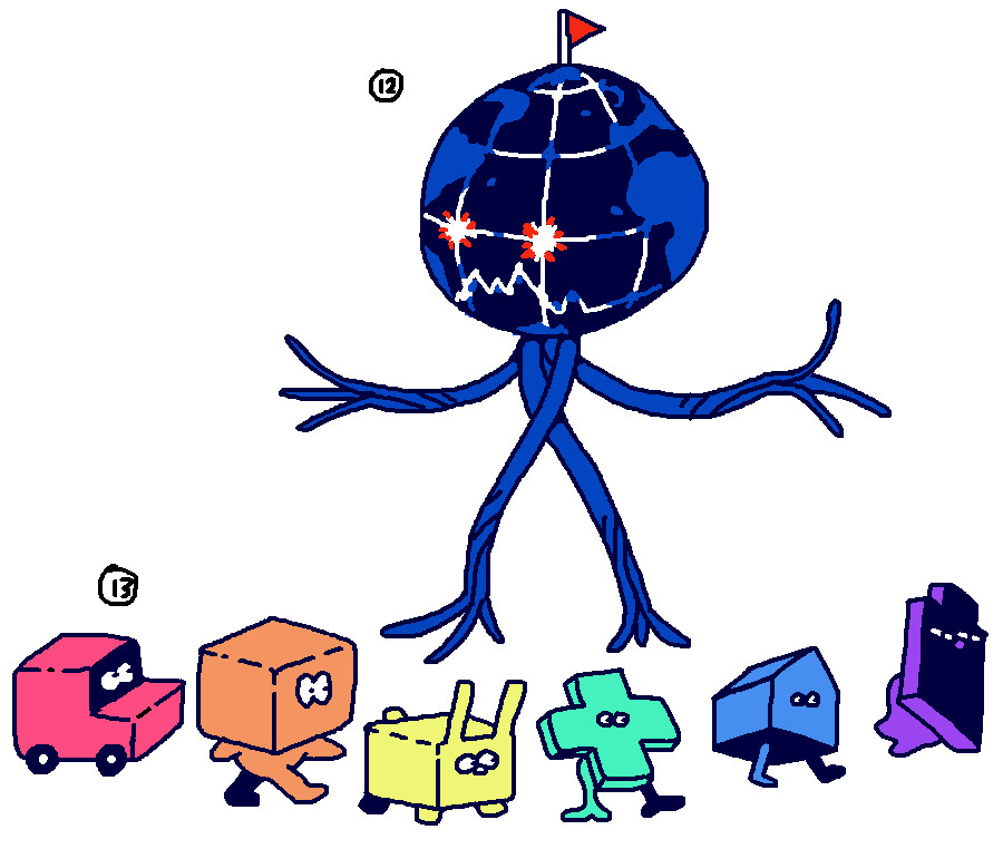 14:「ポップアップ」。タイルの下に隠れていて、いきなり飛び出してくるやっかい者。おでこに触ると、一時的に地面の下にもどっていく。ウザい。