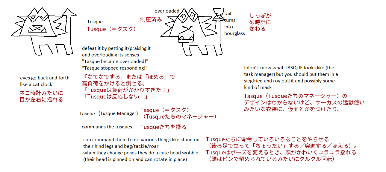 もともと「タスク(TASQUE)」は「TUSQUE」というスペルで、ライオンにしようと思っていました(英語で「Tusk(タスク)」はキバという意味なので)。猛獣使いの「TASQUE」が操る設定で、この「TASQUE」が最終的には「タスクマネージャー」になりました。ムチを持っているのは、そういうわけなんです。ちゃんと理由があるんですよ!
