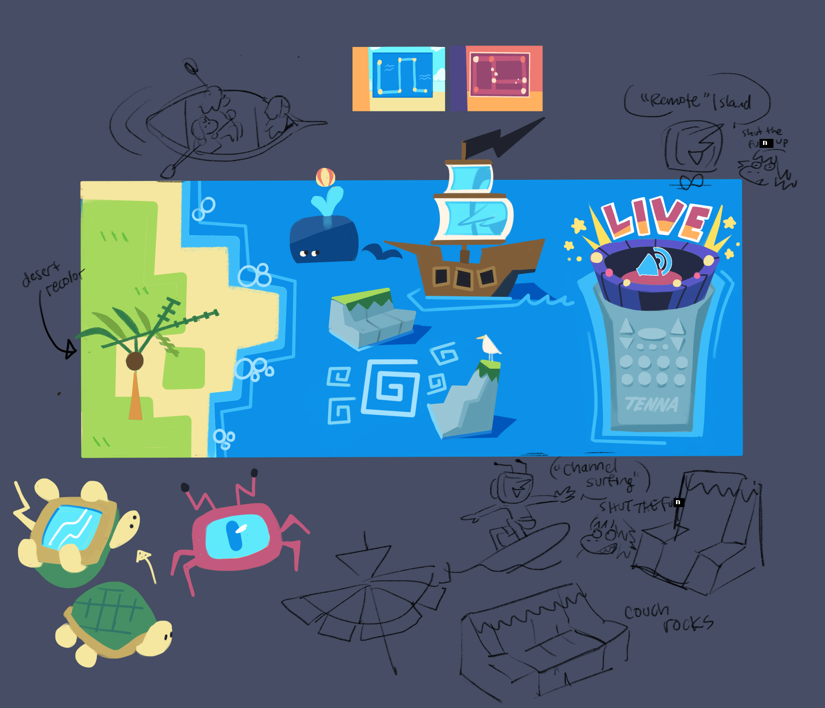 テナの「パーク」については、複数のアイデアを何度も試してはボツにするプロセスを繰り返しました。当初は『ガンスターヒーローズ』に登場する「ブラック」の「スゴロク要塞」や、『マリオパーティ』みたいなものをイメージしていたんですが…作っているうちに、それだと非効率的なばかりか、チャプター中にゲーム内を探索する要素がなくなってしまうことに気づいたんです。それで今度は、『スーパーマリオブラザーズ3』風のフィールドにゼルダ風のマップをいくつも用意することにしたんですが…最終的には、1つの大きなマップに全部をまとめてしまうのがいちばんいいという結論にいたりました。